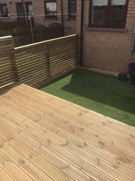 A small no access front and back garden. Treated timber deck, artificial grass, limestone paths and complete with bin store landscaping project in Glasgow. Why not look at the other services we offer at Jollie Landscapes including landscape gardening, fencing, driveways and artificial grass in Glasgow and central belt of Scotland. Call the team today for a free no obligation quote.